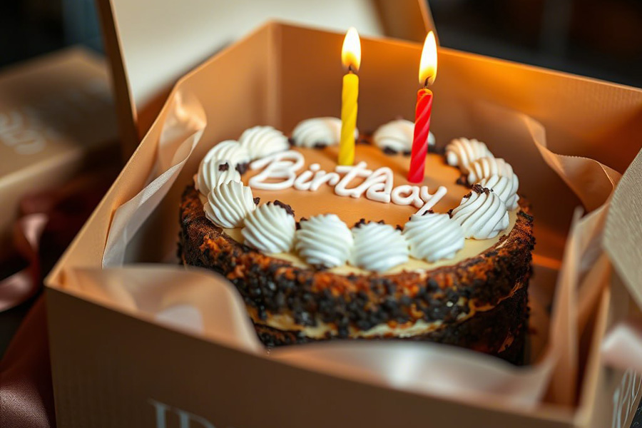 • Подарить на день рождения торт – тоже хорошая идея, если обставить её небанально. Торт можно приготовить самостоятельно или же заказать в кондитерской, а преподнести, поместив в большую коробку. Если торт не относится к фаворитам именинника, то есть другой вариант вкусного презента : коробку нужно заполнить печеньем, испечённым самостоятельно. Секрет в том, что в каждом печенье будет записка с предсказанием. Кстати, десерты можно приготовить самой разнообразной формы.